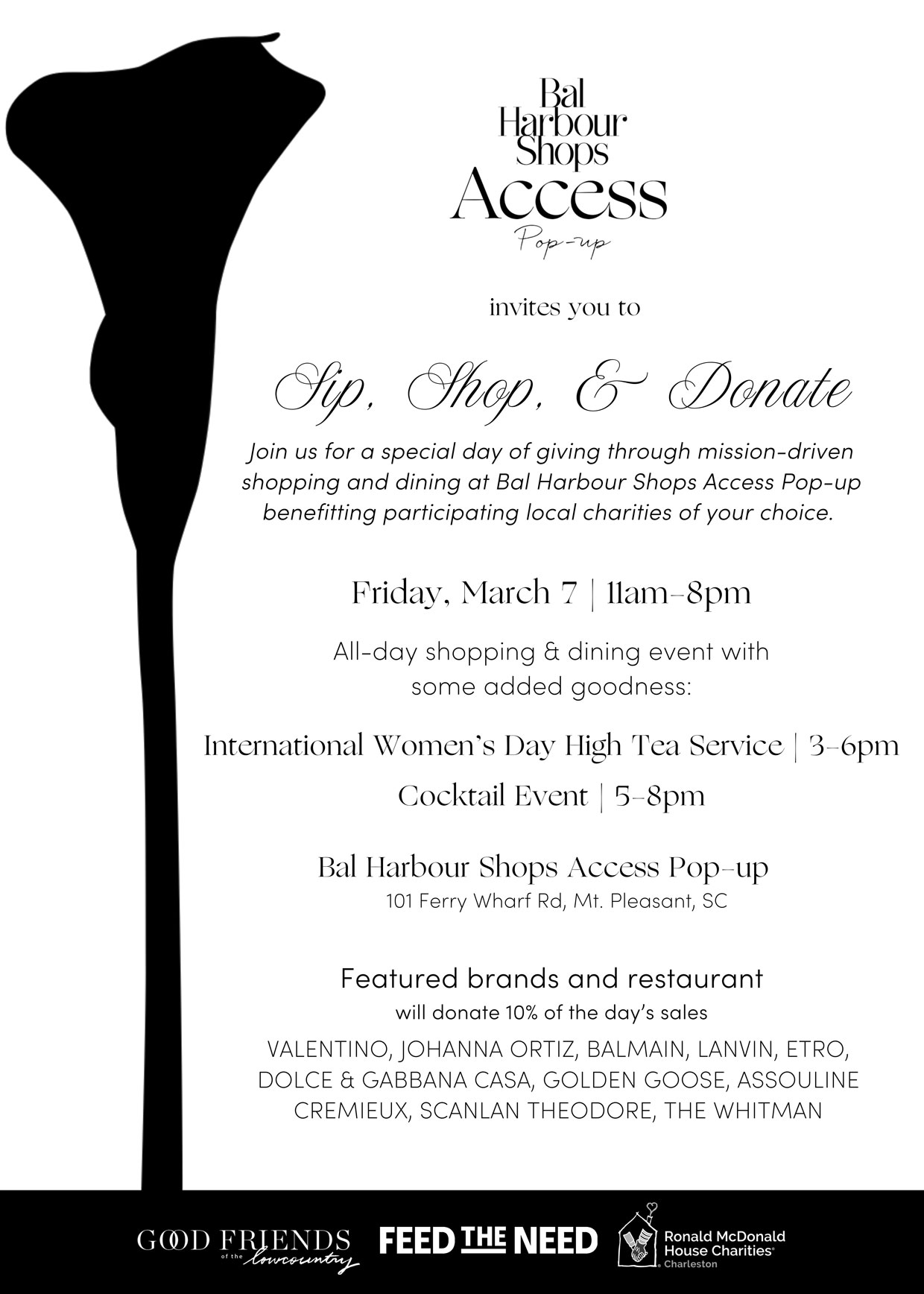 Celebrate the arrival of Valentino at Bal Harbour Shops on March 7th with an all-day Sip, Shop, and Donate event, where 10% of all proceeds from restaurant and retail sales will be donated to local charities including Neighbors Together, Good Friends of the Low Country, Feed the Need, and the Ronald McDonald House. From 3-6 PM, The Whitman restaurant will be offering a special International Women’s Day High Tea, followed by a cocktail event from 5-7PM featuring live music, canapés, and cocktails
